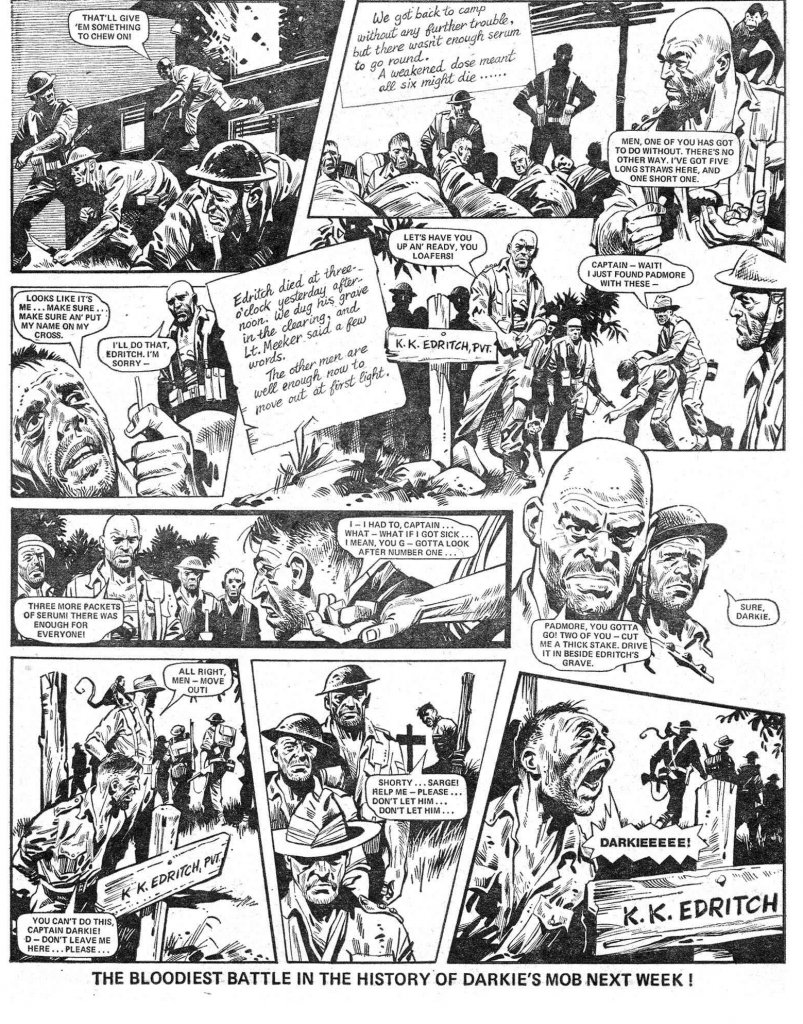 My aim with Darkie’s Mob is to deliver a story grittier than anything Battle has done before, to sail as close to the line of acceptability as I can without, I hope, actually crossing it. Compared with current comic content much of it may seem relatively tame, but it is strong for the time. I know readers will like it even if their MPs won’t, and it’s all of a piece with Darkie’s character, his obsession – how hard is he willing to be on his own men in order to carry out his vendetta against the enemy?