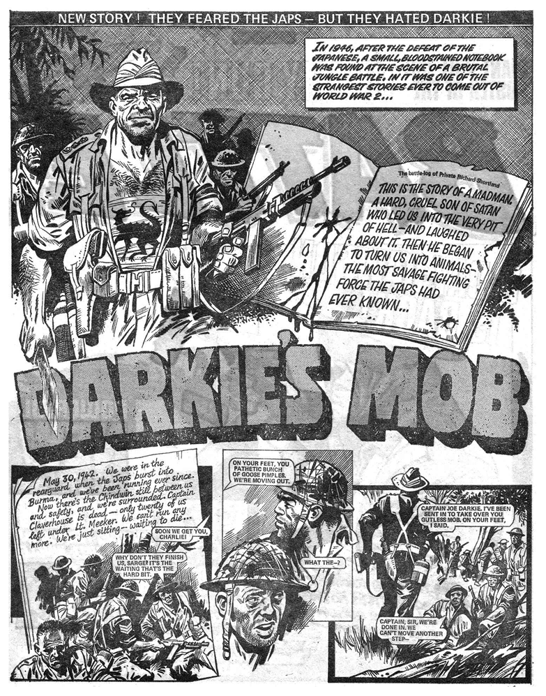 At a recent comic convention someone put to me that I must know where Darkie’s Mob was going when I created it, as the opening presages the end: a bloodstained log book chronicling the exploits of the Mob uncovered at the scene of a brutal battle. To some extent perhaps, but I have no idea how many – if any – of Darkie’s Mob will survive, or that Darkie himself will die, and that the two remaining members who do make it out alive will, rather than accept the safety of repatriation, choose to return to the jungle to continue the fight.