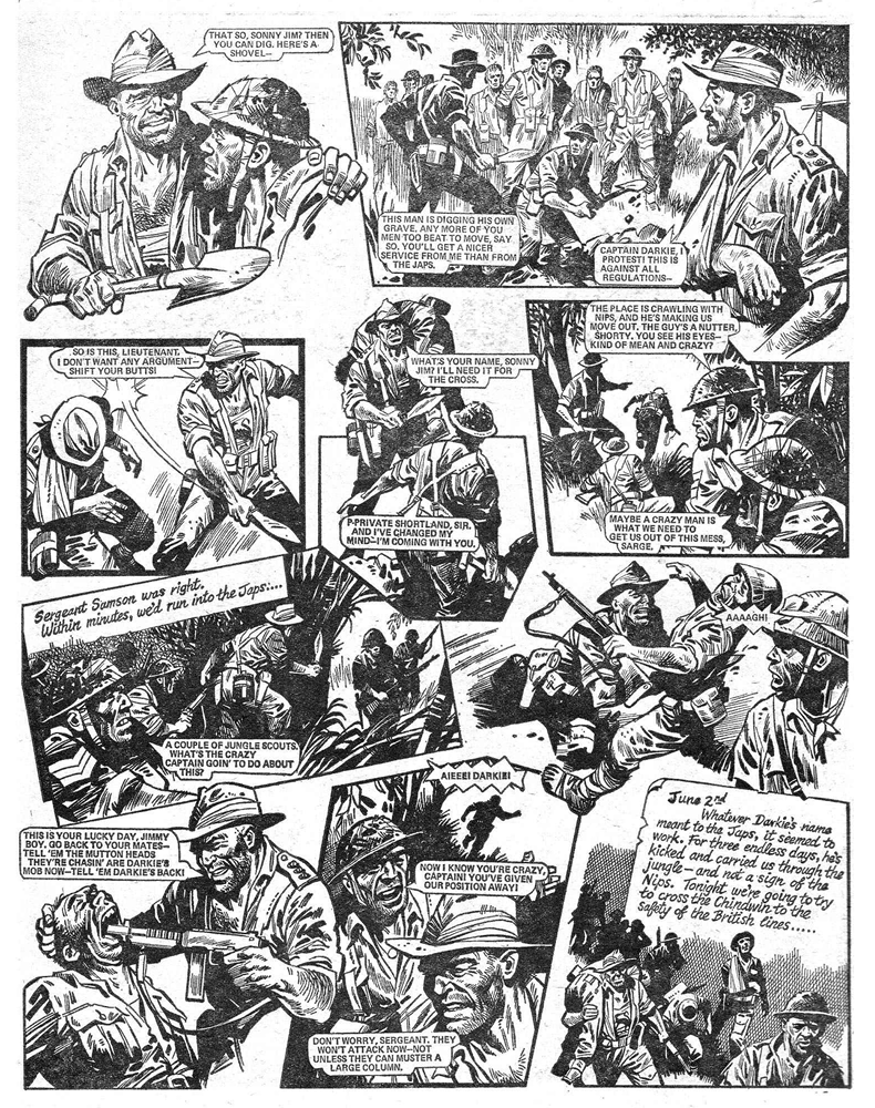 Take a platoon of soldiers who find themselves cut off, marooned in the Burmese jungle, surrounded by heavily-armed units of the Japanese army – seemingly doomed – when out of nowhere appears a British officer, a big, angry bull of a man. His name is Darkie, Captain Joe Darkie. He’s Captain Hurricane without the joke persona, if anything far more fearsome than the enemy they’re facing. With sheer force of personality he whips some defiance into them – they can either die like cowards or show some guts and fight, fight for their lives.